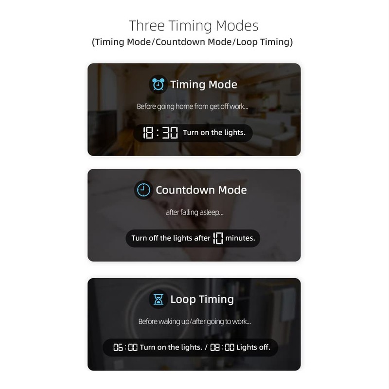 The timing mode can be used before you go home from get off work, you can set the lights on at 18:30. The countdown mode can be used after you fall asleep, such as turning off the lights after 10 minutes. The loop timing mode can be used before waking up or after going to work. You can set to turn on the lights at 6:00 and turn off the lights at 8:00.