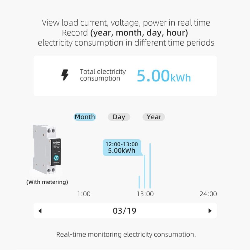 - đź’– In your mobilephone, you can set the switch status of the equipment in different scenarios, and monitor the real-time situation of the load electrical appliances. You can also view load current, voltage, power in real time record (year, month, day, hour) and electricity consumption in different time periods.