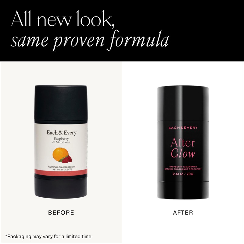 - After Glow - This scent reminds us life is delicious, and full of golden hour walks. Meanwhile, plush tapioca starch and conditioning coconut oil give this sensitive skin deodorant a smooth glide.
