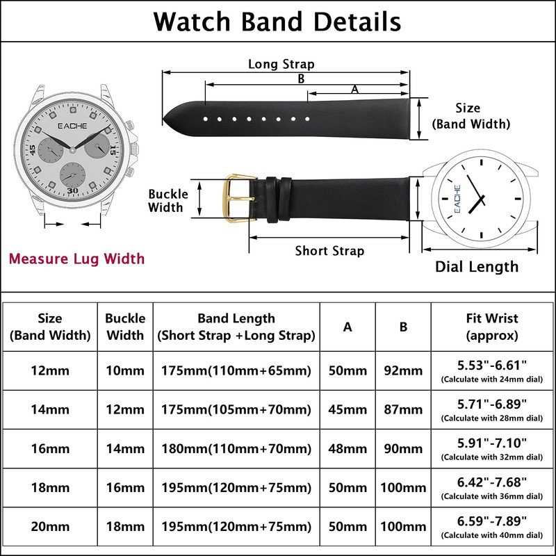 - 【Select Proper Size】Before buying, please measure your watch lug width first, choose proper width watch bands for your watch is very important. EACHE provide 12mm 14mm 16mm 18mm 20mm size watch bands, can meet your different size needs.
