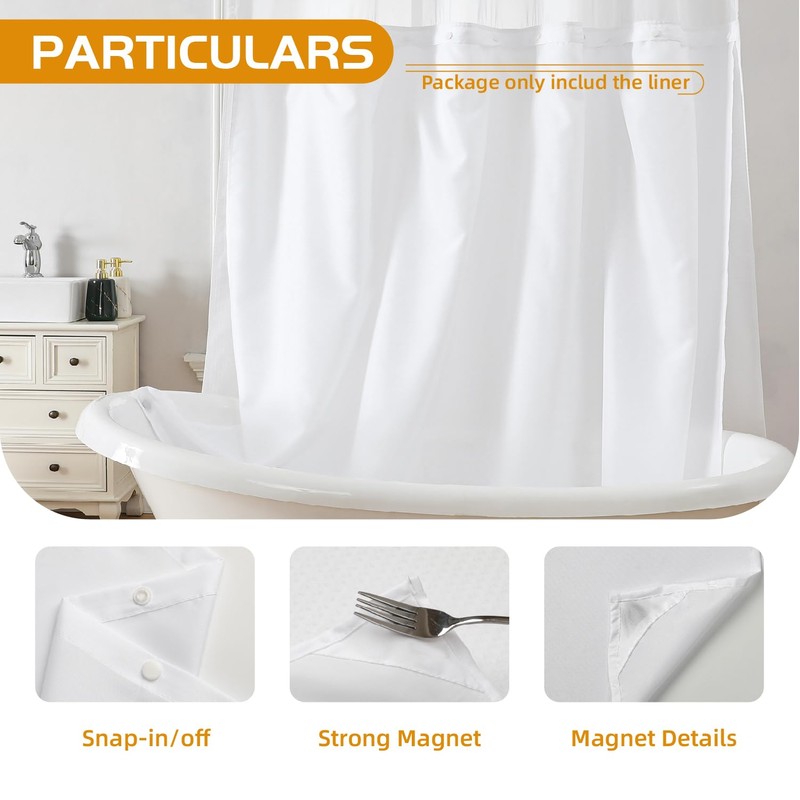 ► Package contains: EACHOPE Fabric Shower Curtain Liner with Snap;Shower curtain and hooks not included