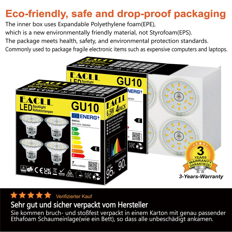 EACLL GU10 LED Bulbs Neutral White 4000K 6.5W Replaces 95W Halogen Bulbs, Pack of 4, 875 Lumen, AC 230 V Flicker-Free Spotlight Beam Angle 120° Spot, Non-Dimmable Shorter Reflector Lamps