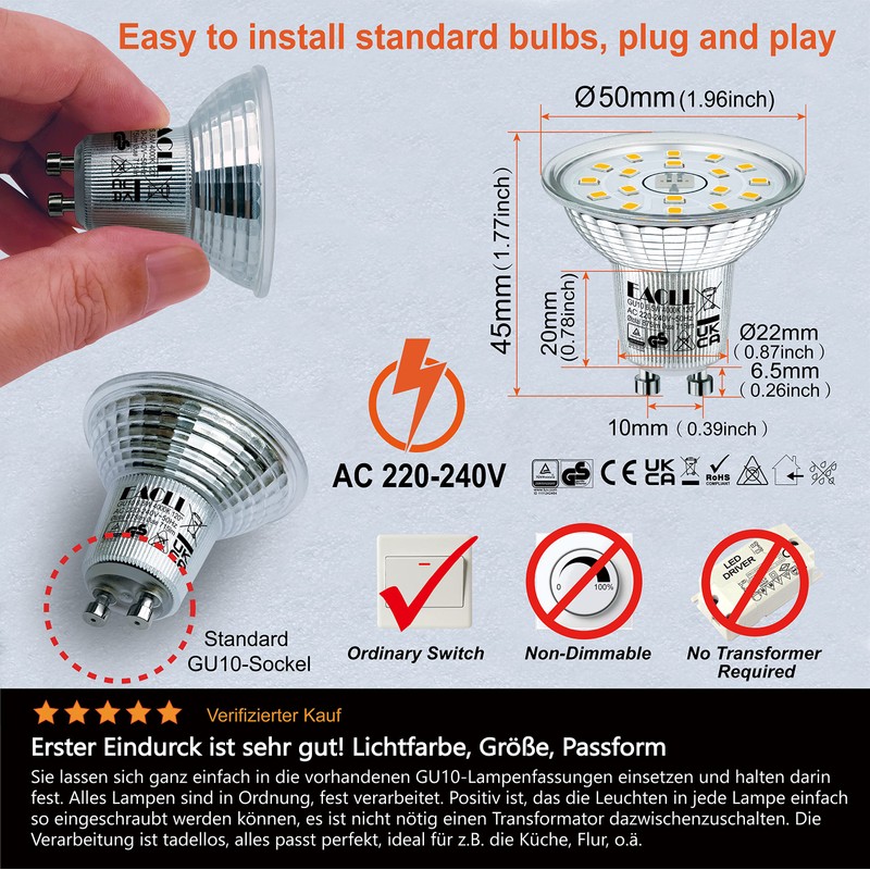 - Easy to install standard light source(Ø50 mm x L45 mm), no need for additional transformer and hiring electricians, you can simply screw in the GU10 sockets, create a cozy and natural atmosphere for your whole house. They are not dimmable and do not require a dimmer.