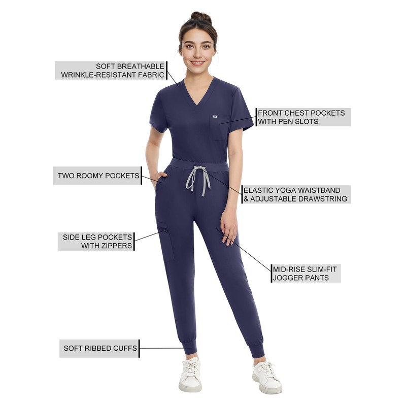 - Knitted Fabric Different from Traditional Fabrics:Our nurse uniforms are made of knitted fabric. The knitted fabric differs from traditional ones as it's soft, stretchy and breathable. Its snug fit brings a more comfortable wearing experience. Besides, it's wrinkle-free, machine-washable and durable for daily medical tasks