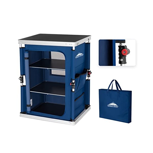 Eagle Peak Outdoor Camping Pop Up Folding Table with Large 3-Tier Storage Organizer and Side Pockets, Easy Set Up Portable Lightweight Aluminum Camping Kitchen, Blue