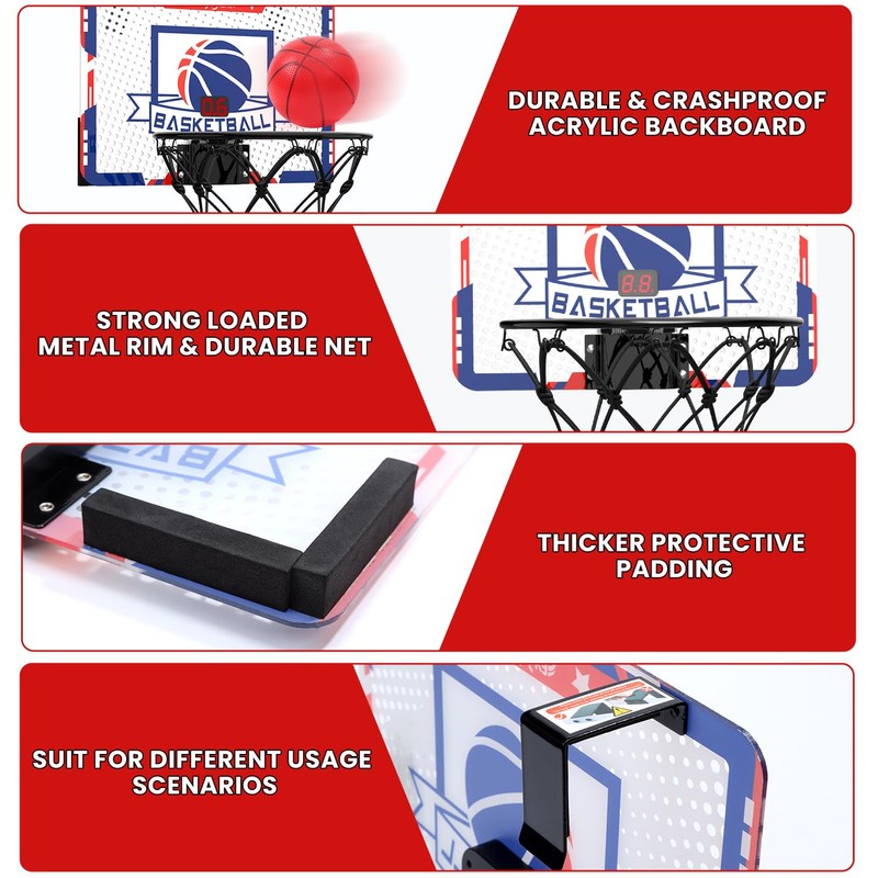 - đăEnhanced Material and Slam DunkingăThe clear 15.9"x12" over-the-door basketball hoop backboard is made of high-quality shatter-resistant PET. The basketball hoop has a heavy-duty steel rim, loaded springs, a firm rubber ball and ball net, and thick protective sponge strips to withstand long shots. Experience the thrill of slam dunking like the pros!