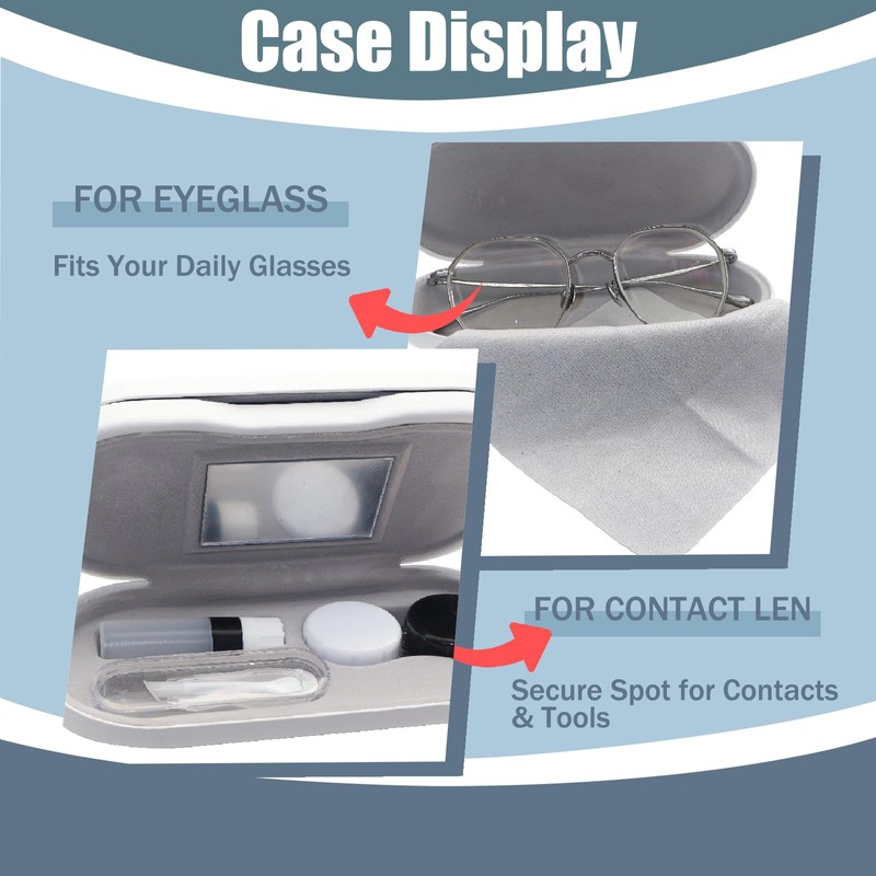 - 2-in-1 Dual Use Design - Our 2-in-1 design combines an eyeglasses case and a contact lens case in one compact, lightweight case. One side stores your eyeglasses, and the other side is specifically designed for your contact lenses and accessories. Save space and enjoy the convenience of having both in one travel-friendly case.