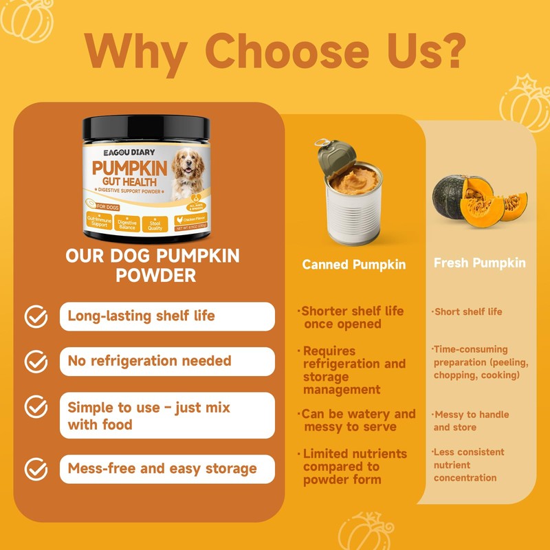 - Supports Digestion and Comfort : Our pumpkin powder for dogs is designed to help support your dog's digestive system. Dog pumpkin promotes healthy digestion, nutrient absorption, and provides relief from issues like diarrhea, constipation, and stomach discomfort. Perfect for dogs with sensitive stomachs