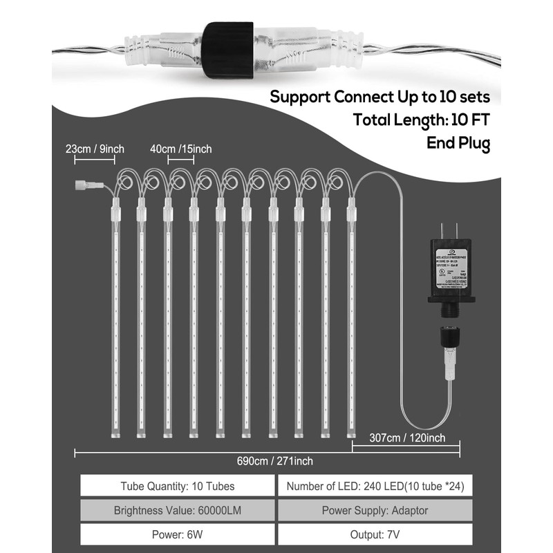 LED bulbs of per tube: 24 Tube Quantity: 10 Tubes Illumination Angle: 360° Number of LED bulbs: 10 Tubes x 24 LED (240 LED Lights) Tube length: 12 inch, Tube Dia.: 1cm Length between US Plug and the First Tube: 9.8 FT/3M Length between Tubes: 15 inch/40cm Total length: 22.6 FT/6.9M Driver: Input AC110V-240V / Output 7V DC Watt: 6W Lifespan: 30000 hrs What You Will Get?1x Meteor Shower Lights 1x UL listed Plug