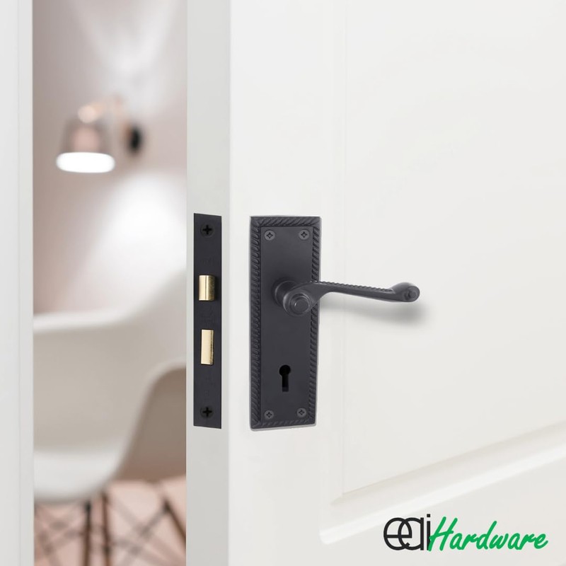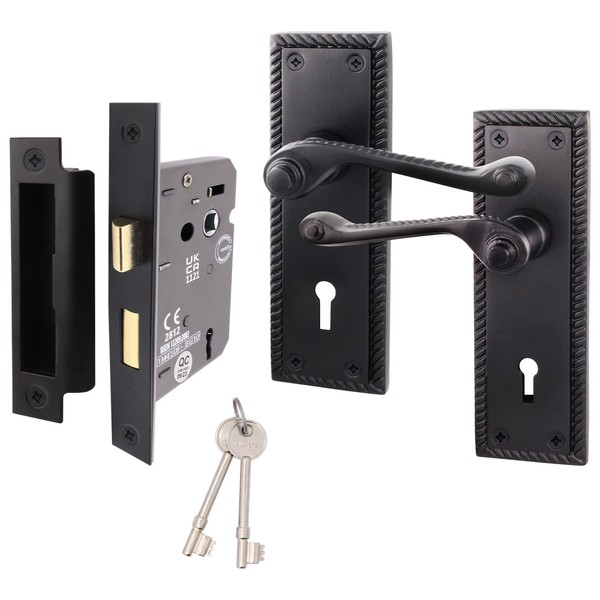 EAI Matt Black Georgian Scroll Door Handle Key Lock Set - 1 Pair Internal Lever Lock Handles, Lock 64mm & Keys - Rope Design