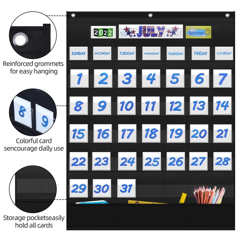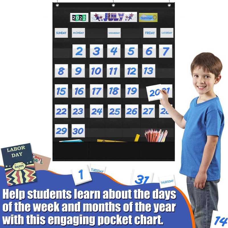 Eamay Classroom Monthly Calendar Pocket Chart with 45 Pocket, 3 Storage Pockets for Easy Wall or Stand Chart (BLACK)