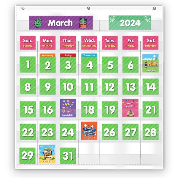 - Perfect Pocket Chart: Measure: 24"H x 25"W, Wall hanging learning calendar has 3 reinforced grommets fits on any word wall, whiteboard or most standard chart stand.