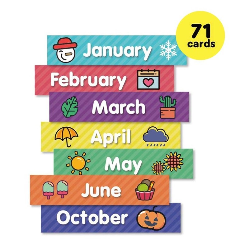 - The calendar set includes 72 pieces: calendar frame , 8 year cards,12 month cards, 7 day cards, 33 date cards, 8 event cards, 3 blank cards.