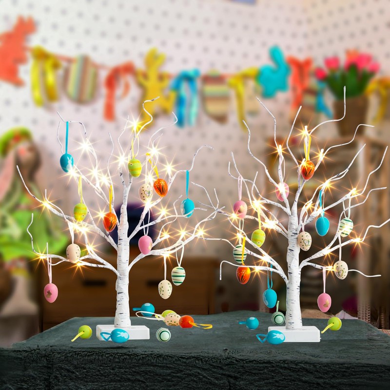- 【Spring Easter decor】Specially designed for spring easter theme party decoration. Easter trees with 24 warm white light, 36 fashion color egg ornaments which looks funny