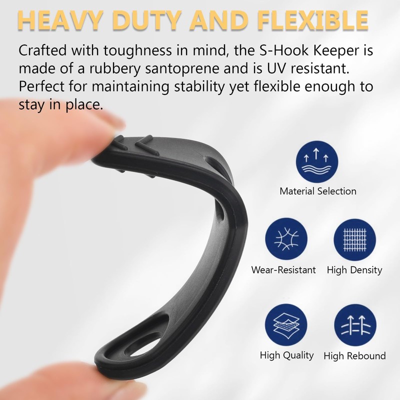 - Quality materials:The S Hook Retainer is made of heavy-duty rubberized material that is UV-resistant. It ensures stability and reliability, yet is flexible enough to be held in place