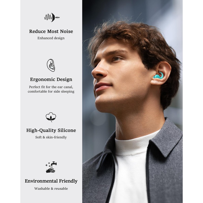 • Designed to Fit The Ear: The ear plugs for sleep are designed to mimic the outline of the ear and fit the ear canal 360 degrees. Even if you lie on your side or turn over, The sleeping ear plugs not easy to slip off. Breathable and comfortable, no pain to wear for a long time. It's worth mentioning that the non-in-ear design of our upgraded ear plugs for noise reduction eliminates the need to insert them deeply into the ear canal, thus avoiding the risk of hearing loss.