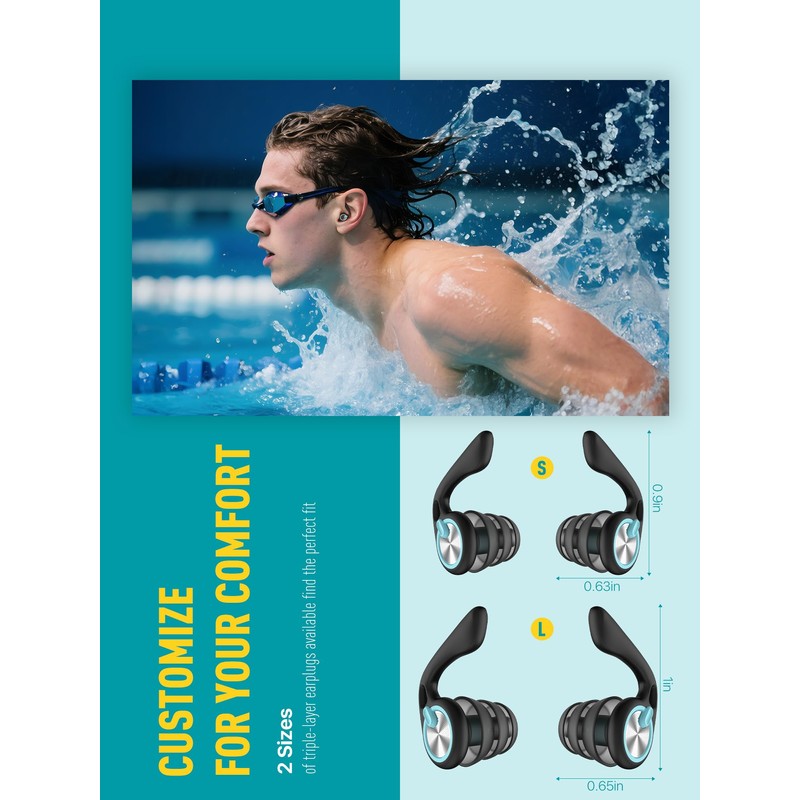 - [CUSTOM FIT]: Includes 2 sizes of triple-layer earplugs to fit all ears with different shapes and sizes. Keeps your swim ear plugs stays in place