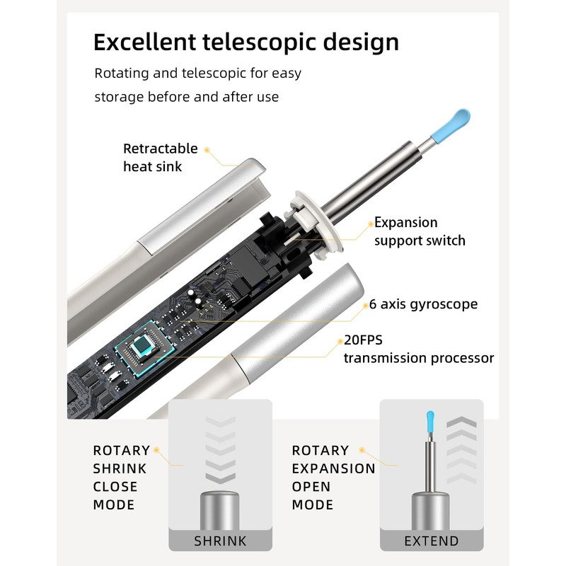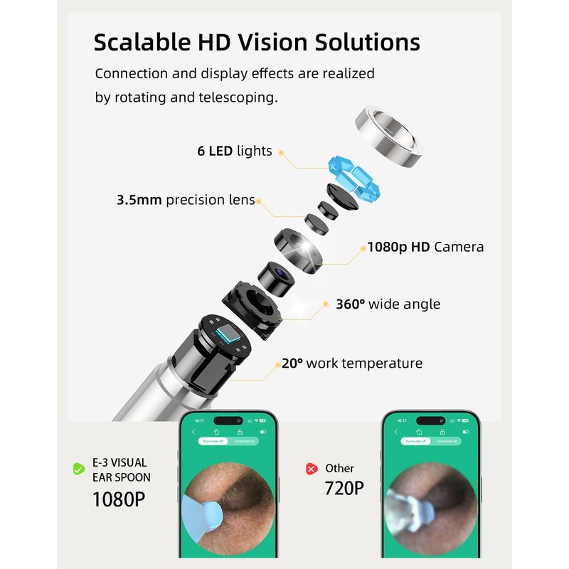 E-3 Ear Wax Remover with Camera with 1080P resolution and 300W HD pixels, E-3 Ear Wax Remover with Camera with Camera will make the ear canal area illuminated by the 6 lens LEDs clearer during use, E-3 Ear Wax Remover with Camera image transmission rate is stable at 20FPS, stable and no latency without dropping frames. E-3 earwax removal kit in working condition, the temperature of the product stays at 20-37°, keeping to provide a comfortable temperature for the human body, E-3 ear cleaner with camera has a retractable function, convenient for travel storage, but also prevents the lens from bumping and damaging the lens and other problems.
