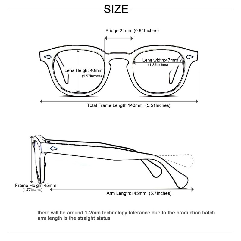 - Size Details: Lens height: 40 mm(1.57 inches); Lens width: 47 mm(1.85 inches); Arm length: 145 mm(5.7 inches); Bridge width: 24 mm(0.94 inches); Frame length: 140 mm(5.51 inches)