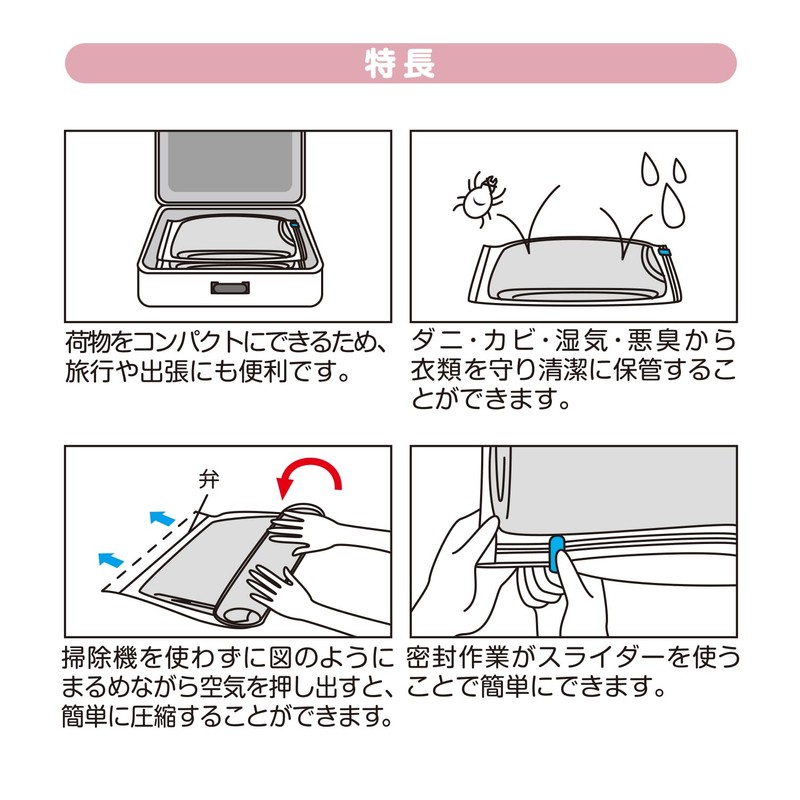 - Squeeze-type compression bag without the need for a vacuum cleaner