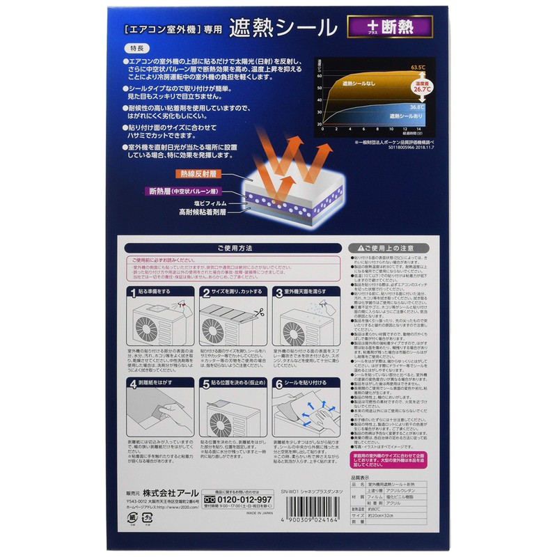 Earl SN-WO1-Z Air Conditioner Related, Heat Insulation, High Weather Protection, Heat Insulation, Thickness 0.008 inches (0.2 mm), Heat Shield for Air Conditioner Outdoor Units + Insulation, 7.9 x 12.6 inches (20 x 32 cm), Set of 4