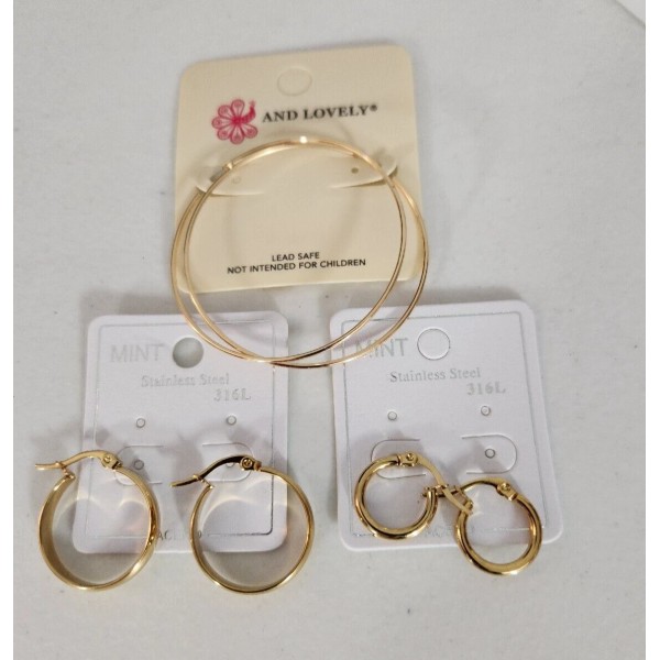 Earrings Jewelry 3 Pairs Gold Tone Hoops Thin 2" Wire Medium 1" Small 1/2" NWT