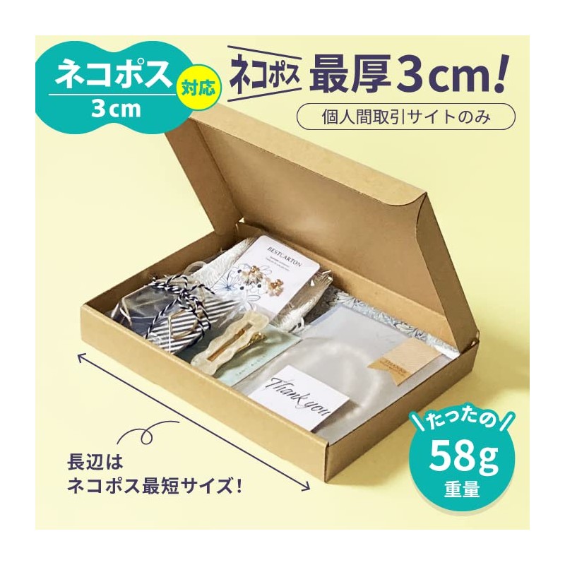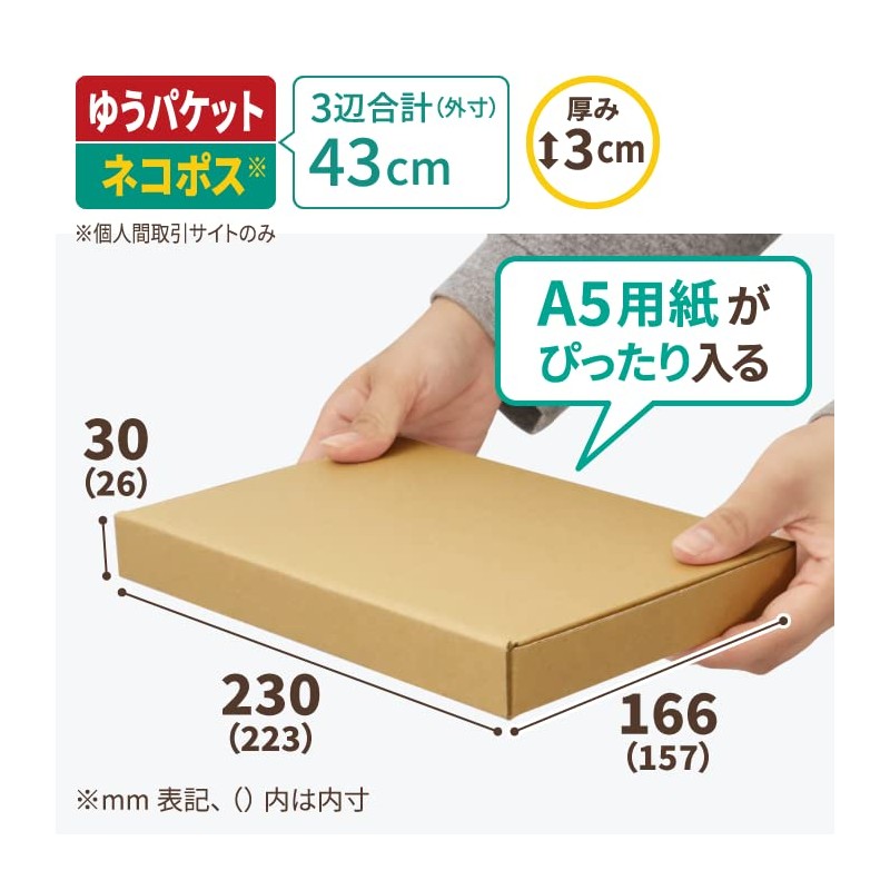 - [A5 / Thickness 1.2 inches (3 cm)] A thin cardboard box with a bottom of less than A5 and a thickness of 1.2 inches (3 cm). Compatible with various mail posts such as Cat Pos, Yuu Packets, Click Post, Kuroneko Yuu Packet, Non-standard Mail