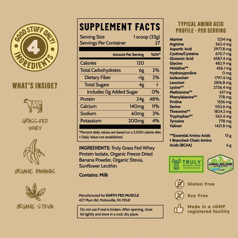 • EARTH FED STANDARD - Our famous four-ingredient combination delivers high-quality whey protein to enhance diet quality and promote muscle recovery. One scoop (31grams) delivers 25g Truly Grass Fed whey protein isolate, 110 calories, 0g fat, and 0g sugar per