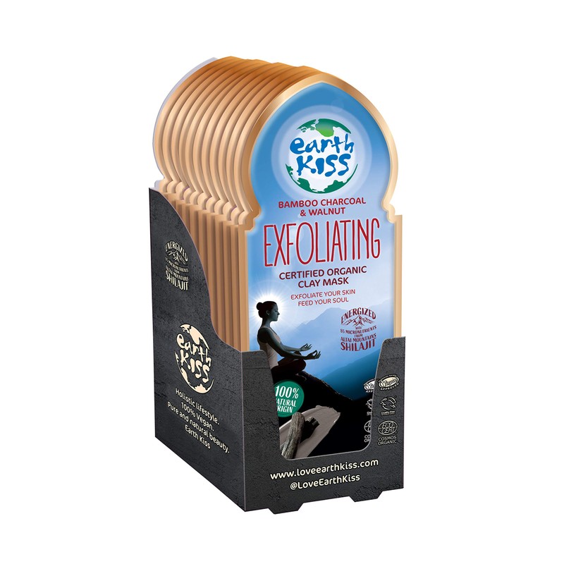 Earth Kiss Inspirations Exfoliating Organic Clay Mask Multipack (x12) starring "Golden Mountain" Shilajit, with Bamboo Charcoal and Walnut to Exfoliate Your Skin and Feed Your Soul