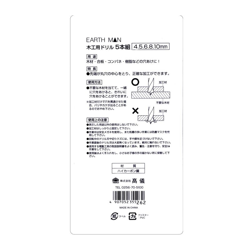 高儀 Earth Man Carpentry For Drills, 4, 5, 6, 8, 10 mm 5 Pairs