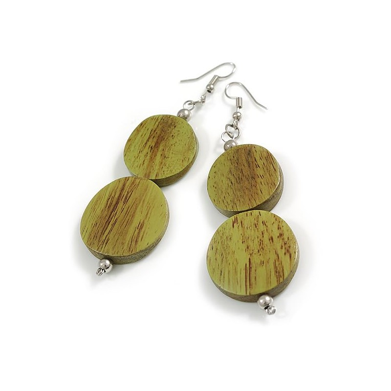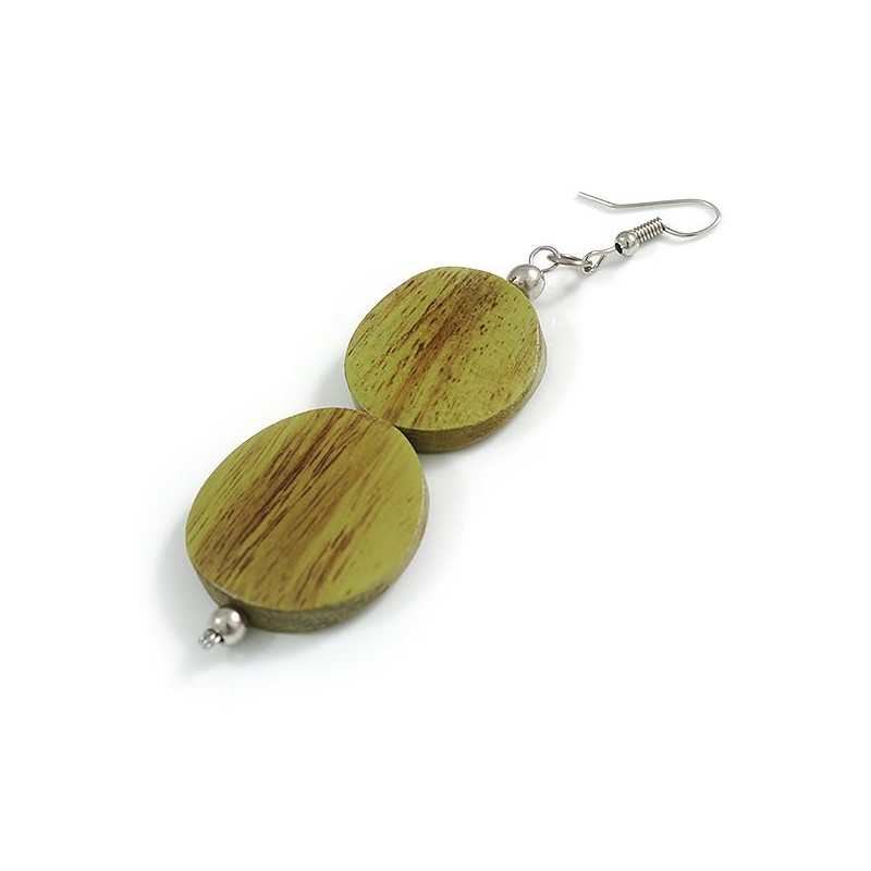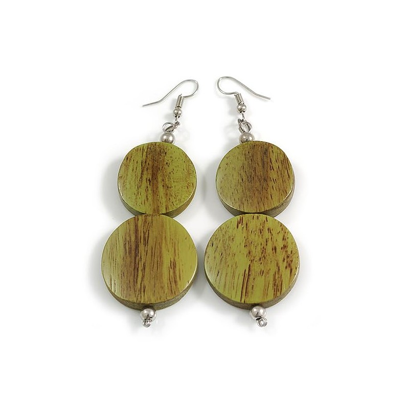 Earthy Harmony Olive Green Double Bead Wooden Dangle Earrings - 85mm Total Le...