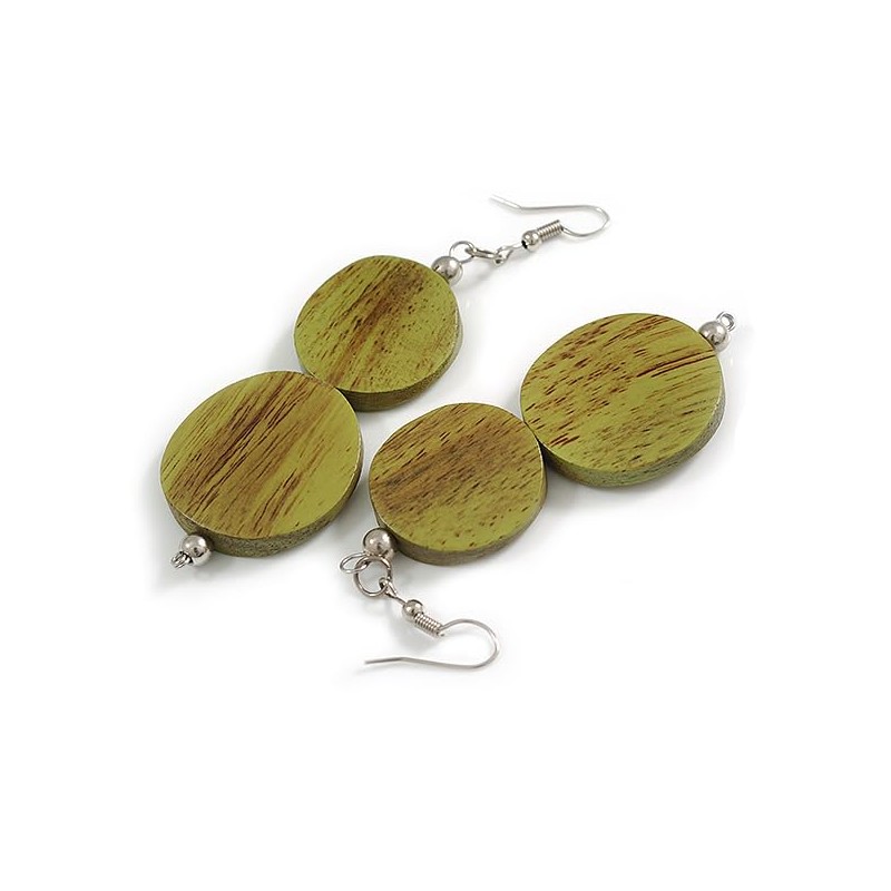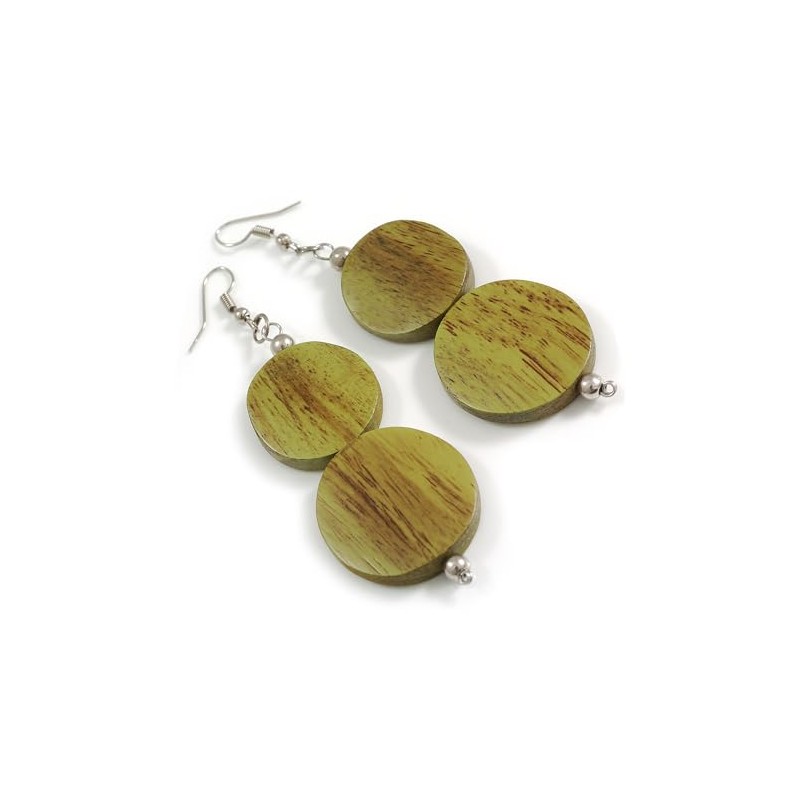 Earthy Harmony Olive Green Double Bead Wooden Dangle Earrings - 85mm Total Length