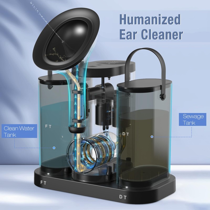 • Sufficient Cleaning: The ear wax removal kit includes a 600ml clean water tank and a 600ml dirty water tank, providing ample capacity for uninterrupted ear cleaning. The 2000mAH battery capacity supports continuous operation, allowing you to thoroughly clean your ears without interruptions or the need to change water.
