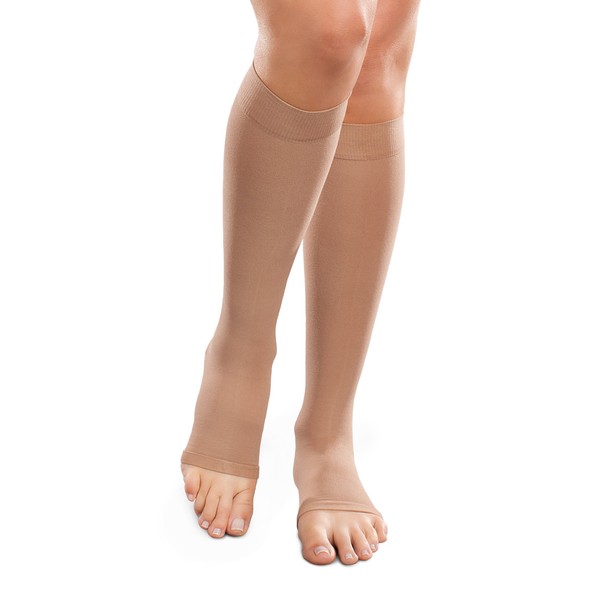 Ease Opaque Open-Toe Knee Highs - 20-30mmHg Moderate Compression Stockings (Sand, Medium Long)