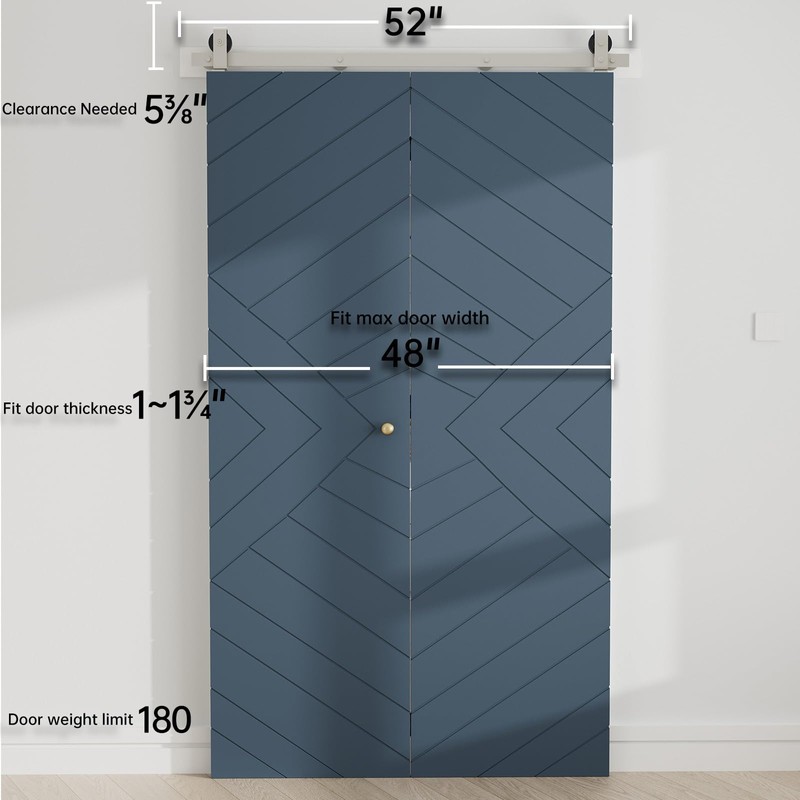 • 【𝗥𝗲𝗺𝗶𝗻𝗱𝘀】 Fit up to double 24" wide door;Fit Door Thickness: 1" ~ 1-3/4"(25mm~45mm);Door weight capacity: 180lb.The track length should be door opening size + 4" (100mm),at least 5-3/8" clearance needed from top of door and ceiling.