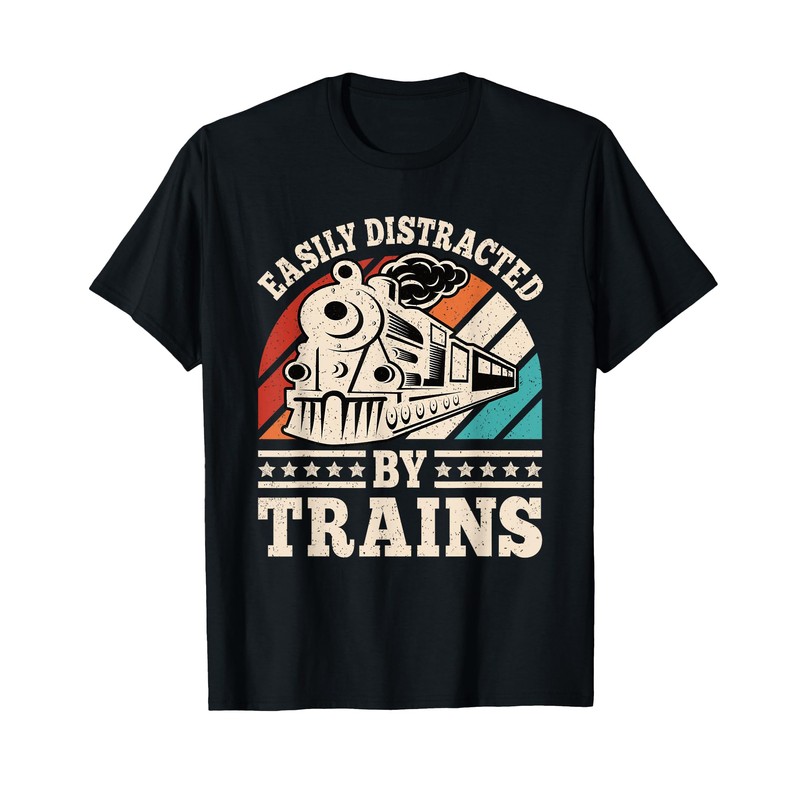- Retro Easily Distracted By Trains print for men, women, boys, girls, and kids who love trains and model trains.
