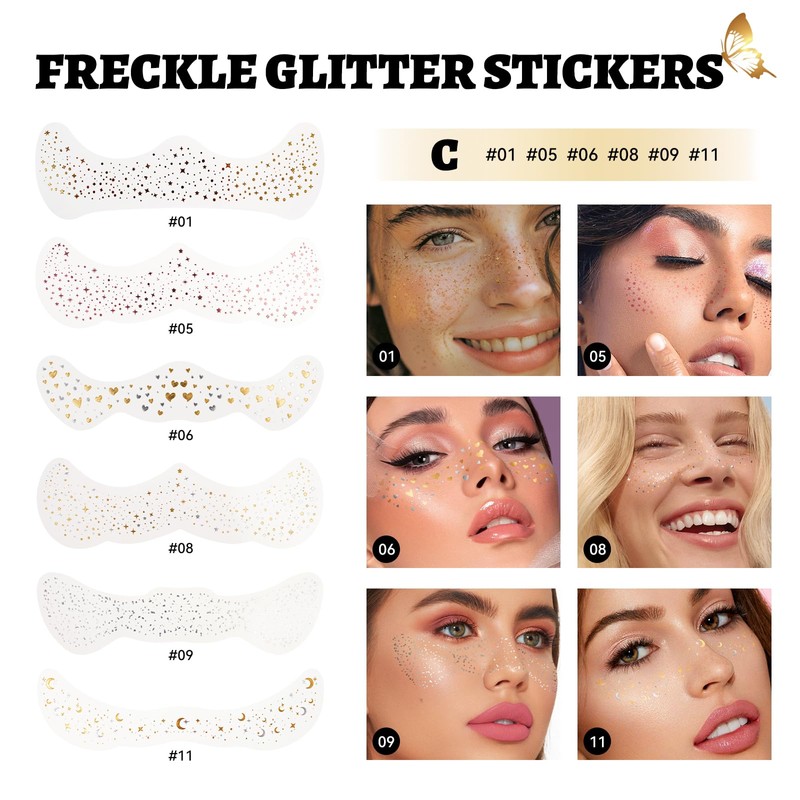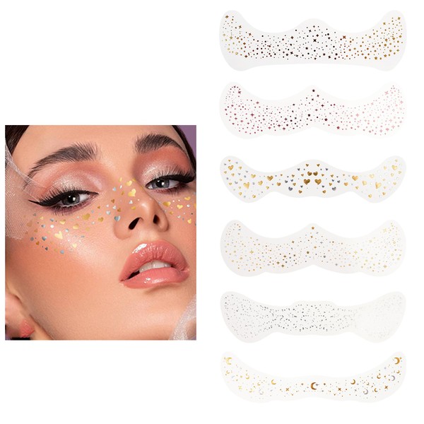 - ✨【Multiple Patterns】The set includes 6 sheets of tattoo stickers which are in 6 different shapes, giving you more makeup possibilities, suitable for different moods and styles, and glitter tattoos for girls. There are regular freckles patches, moon, star, butterfly, heart, etc. in the kit, look so cute! All of them are made of shimmer gold foil technique. You can use it alone or combine them to create various styles, just unleash your creativity!