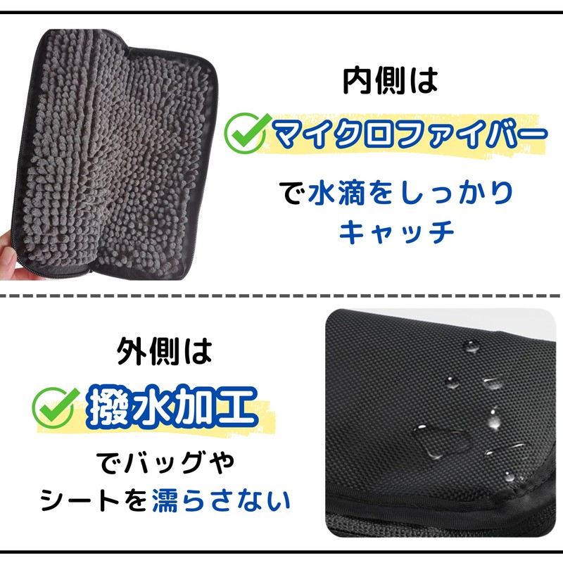 - 吸水性能:内側はマイクロファイバーで水滴をしっかりキャッチ 外側は撥水加工でバッグやシートを濡らさない