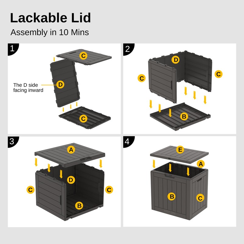 - : This deck box adopted upgraded resin material (SGS 1000plus) that protects its exterior from fading and keeps its interior dry no matter what the weather is
