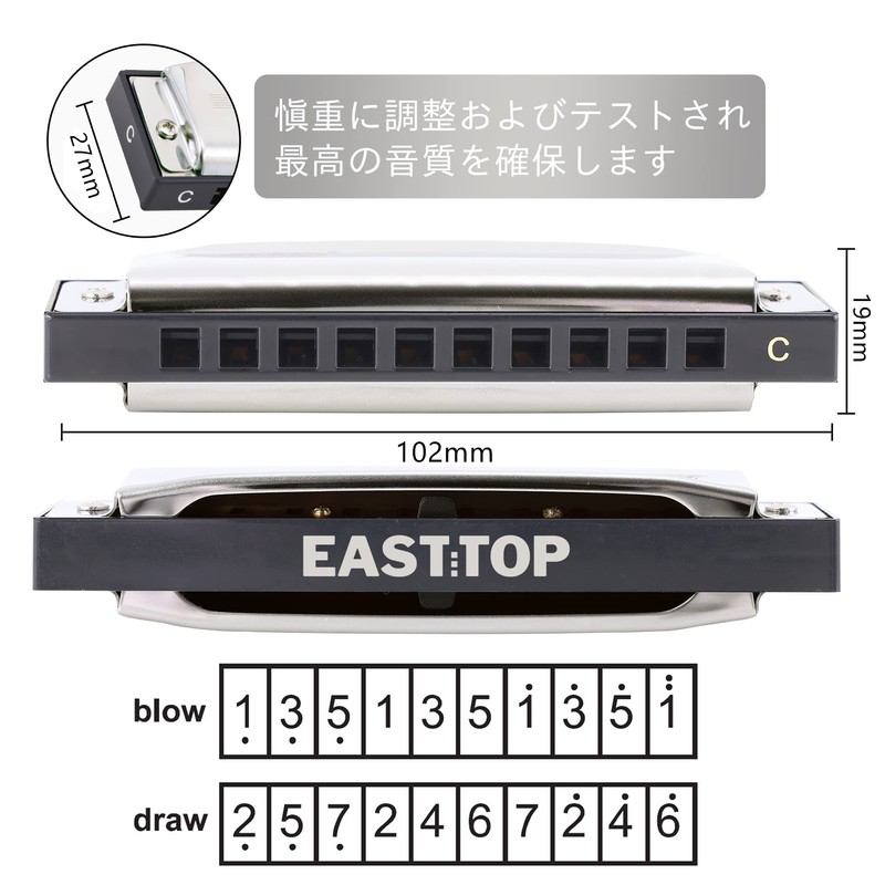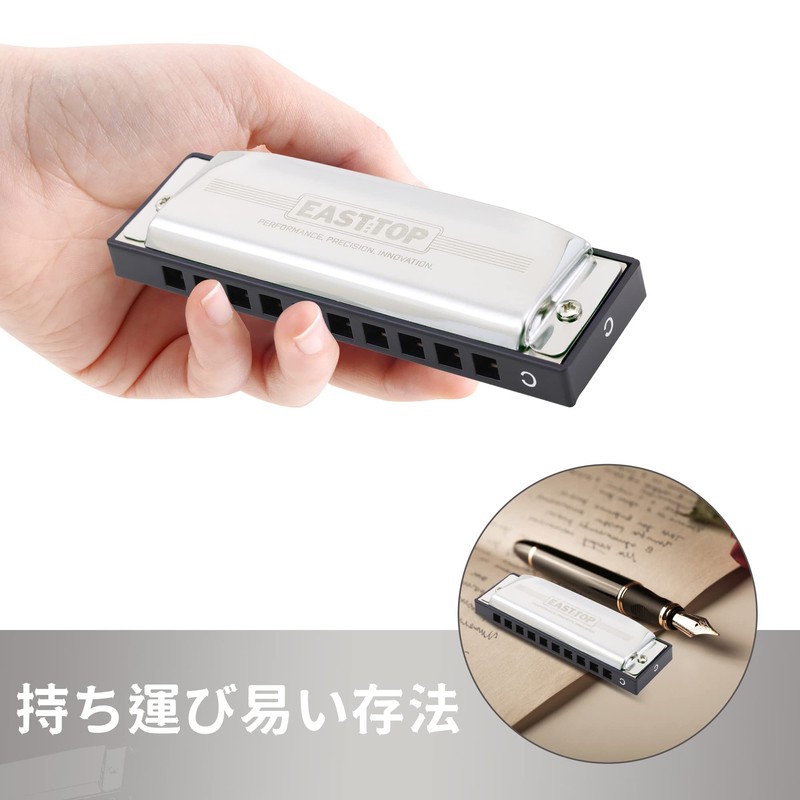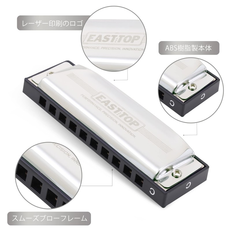 • (Elegant Material) EAST TOP harmonica has an ABS resin spout that is resistant to corrosion, and can be safely washed with water in the mouth, making it hygienic and durable, and easy to clean. The cover is made of very sturdy stainless steel that is hard to deform. The body and cover are firmly secured so there is no leakage and the air tight so that it is easy to blow with little breaths