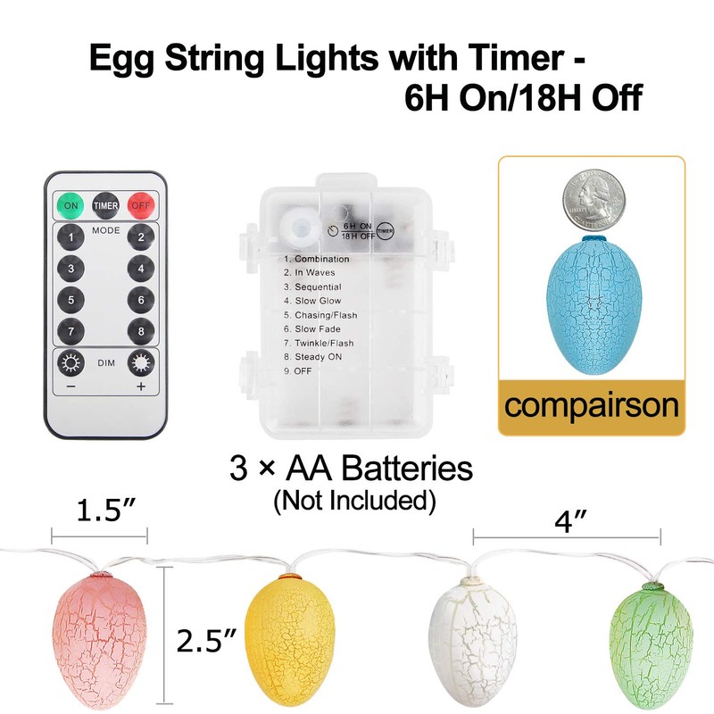 Easter egg led string lights with timer, no wiring required, and not a battery eater, press the remote and set timer function to save your time.