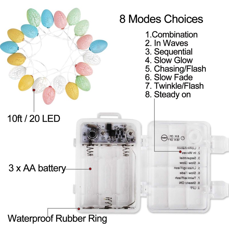 - 20 LED BATTERY OPERATED STRING LIGHT - This easter egg string light has 6.5ft length with 20 long-lasting low voltage bulbs required 3 x AA Batteries (Not Included), can be used anywhere conveniently. Safety and Energy-saving.