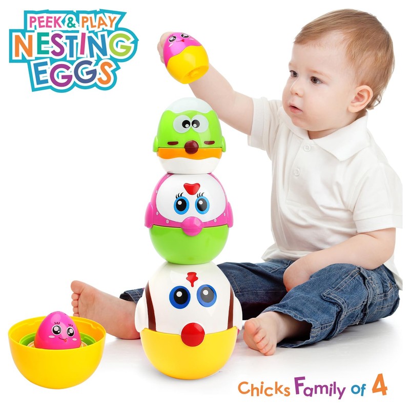 - 🐣 [FUN & CLASSIC EASTER EGG TOYS] Here's a fun new twist on stacking and nesting dolls, colorful oversize eggs! Kids will love the way the eggs’ top and bottom halves nest together, cute and colorful nesting eggs transform into 4 happy egg family characters. Each egg toy is a different size, color and a distinct happy face that tells its own story. This will give your kid an imaginary play, babies will create new stories about Easter, or other vivid and rich stories around the chickens' family.