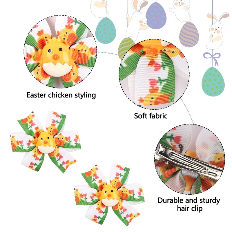 Product Overview: Introducing our Easter hair clips, which come in two delightful designs: Chick and Rabbit. Crafted with alligator claw clips, these hair bows are perfect for kids, women, and girls, adding a festive touch to your Easter celebrations.