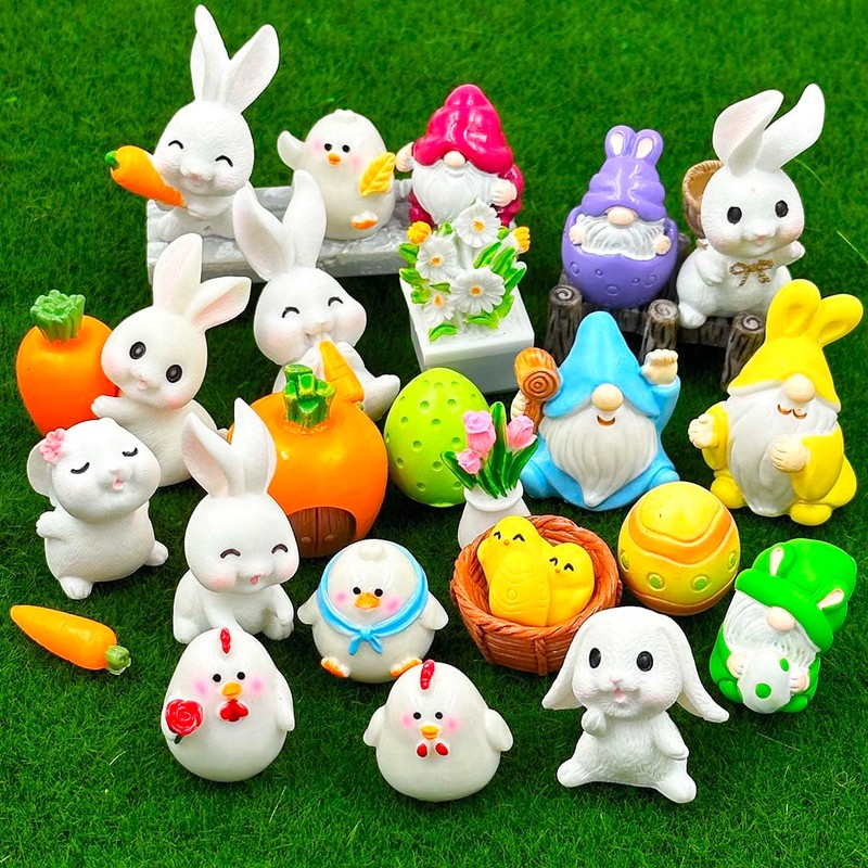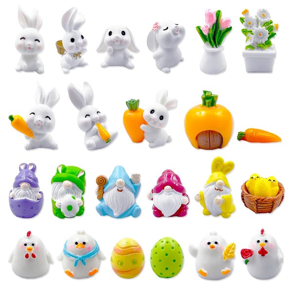 Easter Mini Rabbit Figurines 23pcs Bunny Gnomes Egg Resin Miniatures Figures to Hide Chicken Animal Flower Carrots Fairy Figures for Garden Spring Ornament Egg Stuffers Gift