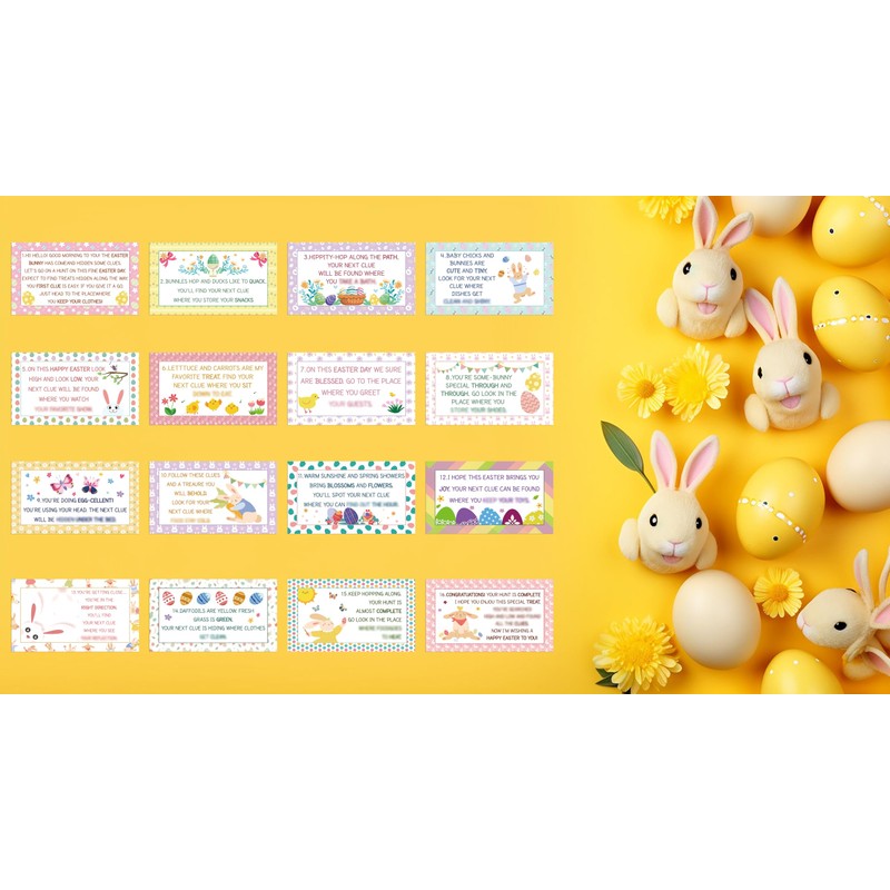 Easter Party Games - Easter Bunny Scavenger Treasure Hunt Clues Cards - Easter Party Supplies Spring Party Decorations (16 Cards with Colourful Envelopes)-01