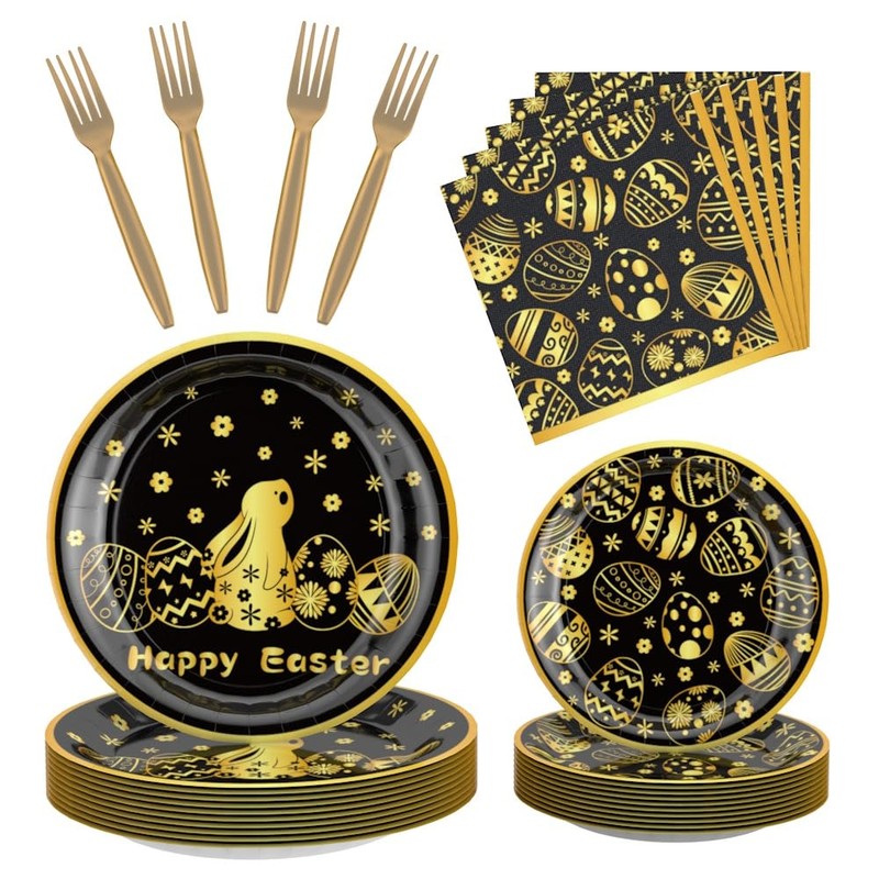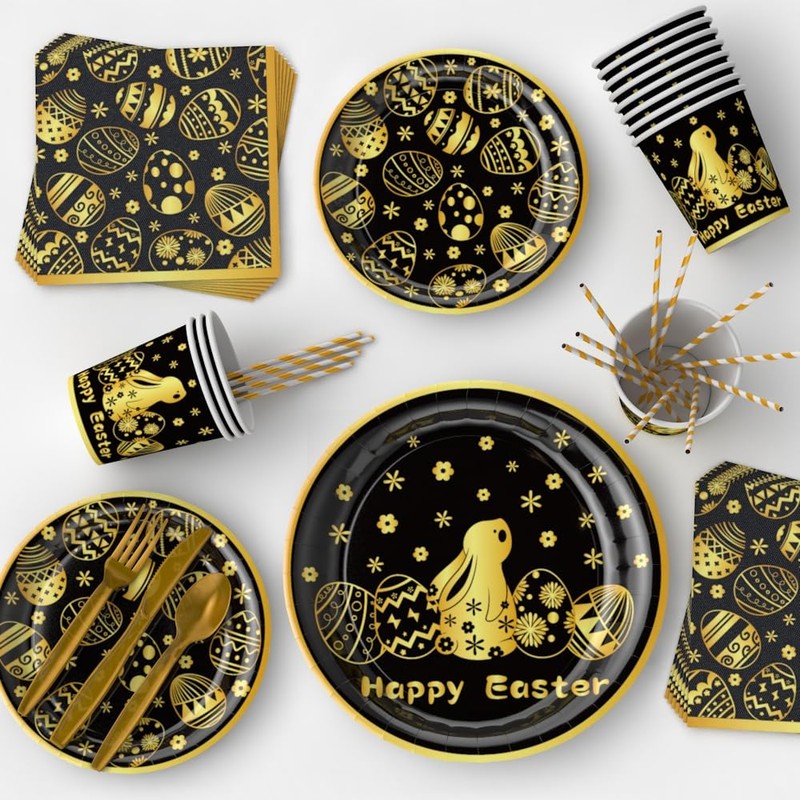 Easter Party Supplies,Happy Easter Disposable Tableware Set, 129Pcs Including Paper Plates, Luncheon Napkins Cups Forks Spoons Knives Straws Kids Easter Party Decorations, Serves 16 Black and Gold