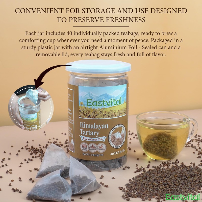 EastVital Tartary Buckwheat Tea 240g β Caffeine & Sugar Free Roasted Buckwheat Tea with Nutty Aroma & Toasted Warmth, Airtight Jar with Pull Design & Removable Lid β 40 Teabags