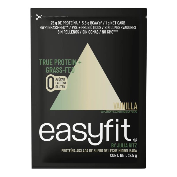 Easy Fit by Julia Ritz es un suplemento alimenticio en polvo. Cada sobre contiene 32.5 g de proteína premium GRASS-FED, proporcionando 25 g de proteína de alta calidad por porción, ideal para apoyar tus objetivos de fitness y nutrición.