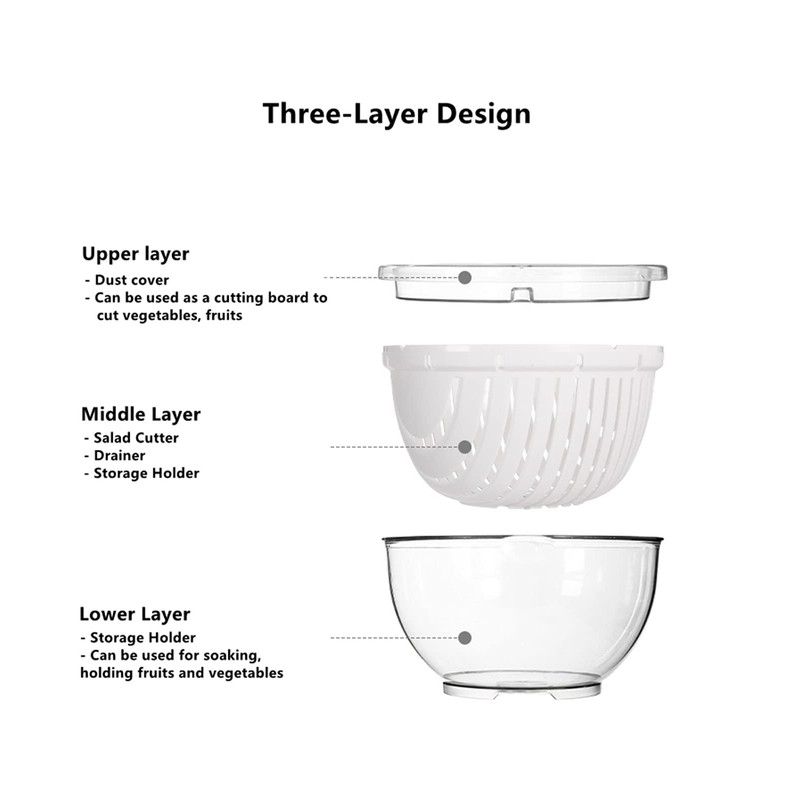This Vegetable Salad Cutter Bowl is three layered with 90° rotatable, multi functional, a essential kitchen tool, ideal for washing, draining, cleaning and slitting all types of fruits, vegetables and pastas.